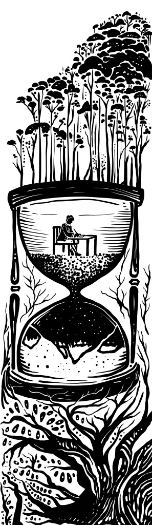 Visual: A black and white drawing of William Wordsworth in an hourglass, flanked by trees and roots.